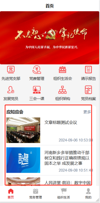 黨建宣傳頁(yè)面展示最近黨內(nèi)資訊,其中包括時(shí)政要聞、基層動(dòng)態(tài)、黨員先鋒、組織活動(dòng)、榜樣精神、群團(tuán)工作、反腐倡廉等內(nèi)容分類,詳情包括文本、圖片等展示形式圖文并茂的展現(xiàn)了最新黨內(nèi)資訊。